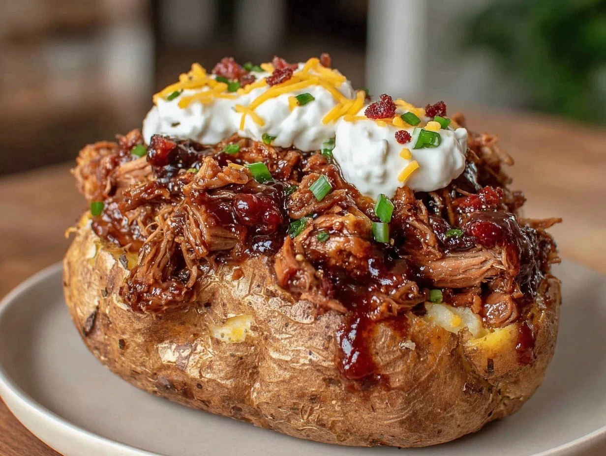 A comforting and indulgent loaded baked potato topped with smoky BBQ brisket, tangy BBQ sauce, creamy sour cream, sharp cheddar, and fresh green onions. Perfect for a quick dinner or game day treat.