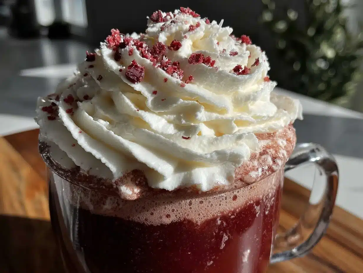 A rich and creamy red velvet hot chocolate with a velvety texture, topped with homemade whipped cream. Perfect for cozy evenings and festive occasions.