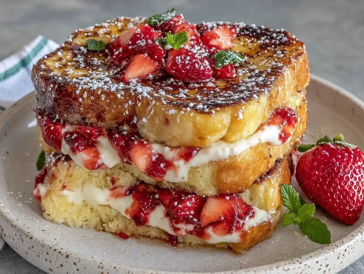 A quick and easy stuffed French toast recipe featuring a creamy cream cheese and fresh strawberry filling, perfect for breakfast or brunch.