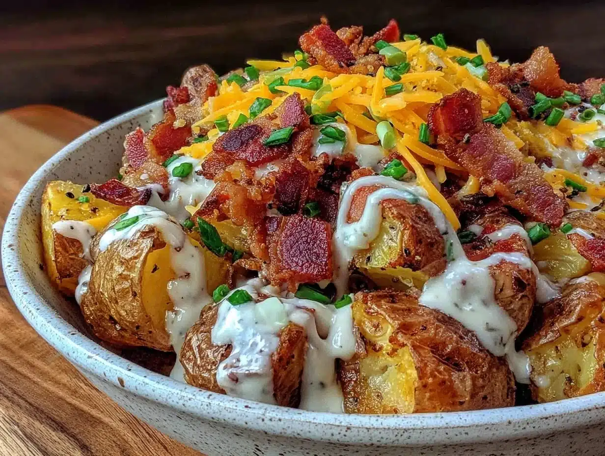 “You really outdid yourself this time,” my neighbor said last weekend, glancing over the fence with a grin as I carried a bowl of this crispy loaded baked potato salad to the backyard BBQ. Honestly, I hadn’t planned on bringing anything fancy—just a quick side to throw together after a hectic day—but somehow this recipe turned into the star of the gathering. It started as a simple idea: what if a potato salad had that irresistible crunch from a baked potato’s skin, with the smoky punch of bacon and the tang of ranch dressing? I was skeptical at first—potato salad is usually creamy and soft, right? But giving it some crisp bits and salty bacon was a game changer.