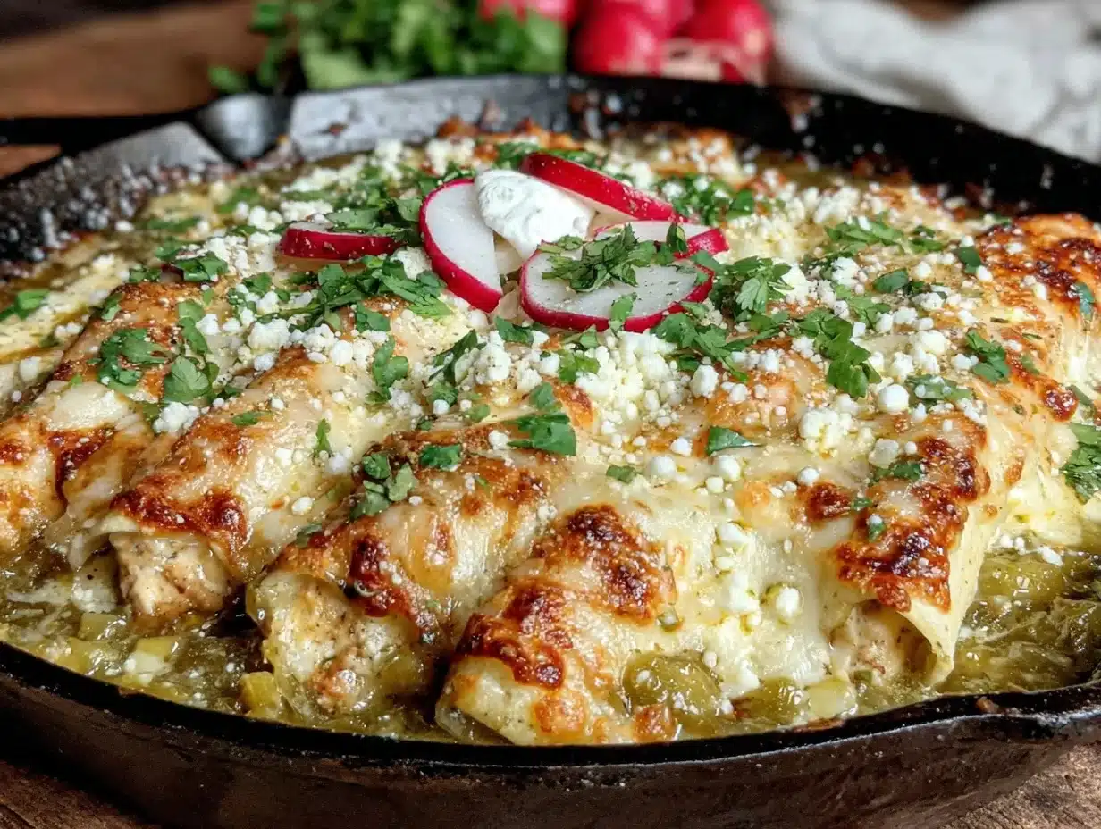 A quick and flavorful skillet chicken enchiladas recipe featuring a tangy green tomatillo sauce, perfect for busy weeknights and cozy dinners.