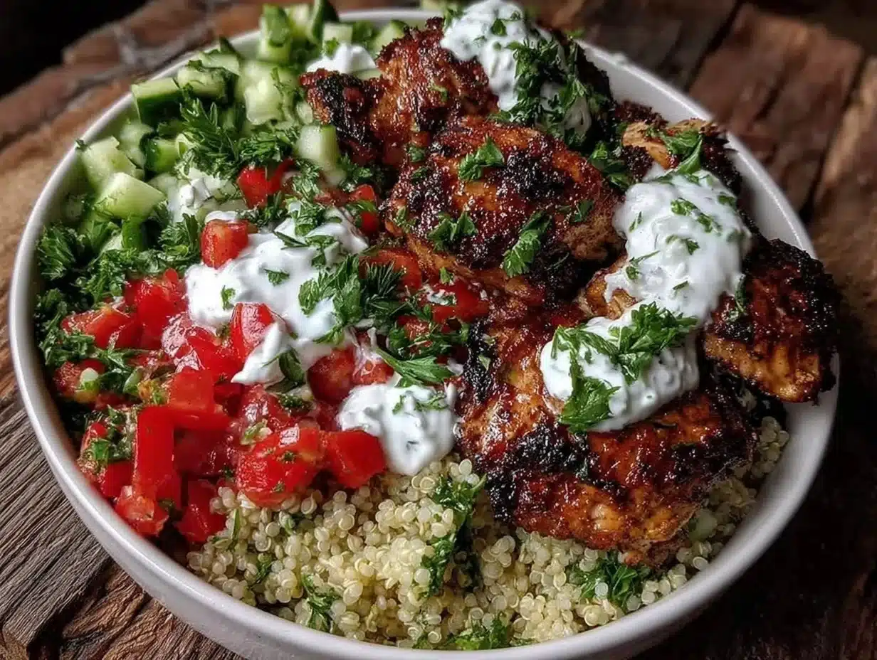 A simple, fresh, and satisfying Mediterranean chicken bowl featuring juicy spiced chicken, fluffy quinoa, and creamy tzatziki sauce. Perfect for a quick, healthy meal that’s adaptable and packed with bold flavors.