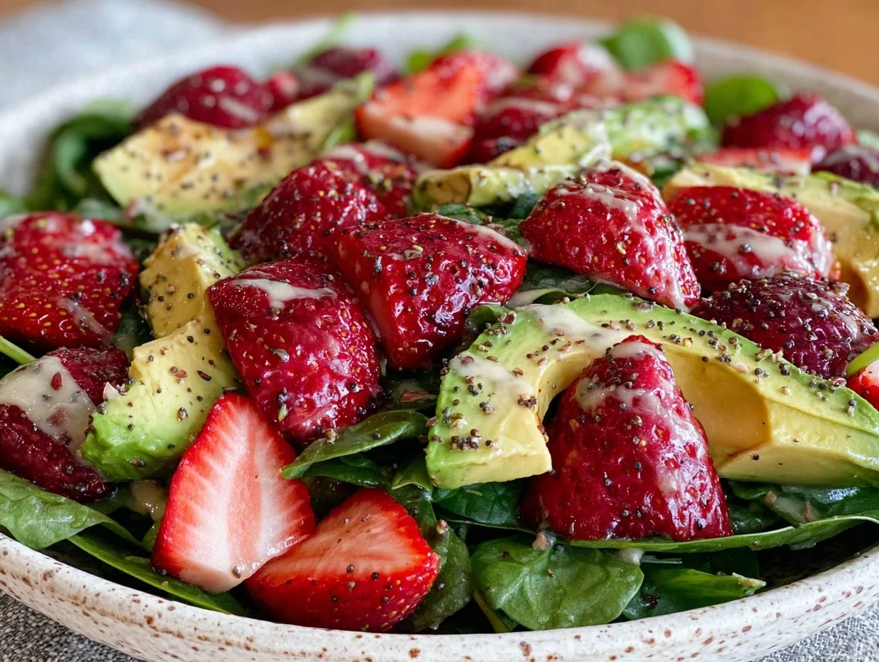 A light, fresh salad combining baby spinach, ripe strawberries, creamy avocado, and a tangy homemade poppy seed dressing. Perfect for a quick lunch, brunch, or side dish.