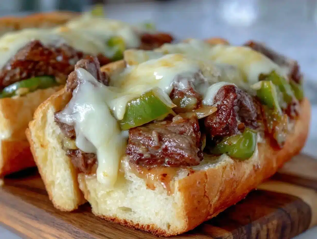 A quick and easy Philly cheesesteak recipe featuring thinly sliced juicy ribeye, caramelized onions, green peppers, and melted provolone cheese on toasted hoagie rolls. Perfect for family gatherings, potlucks, or a comforting meal any time.